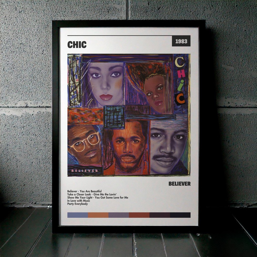 Nuestra colección de cuadros de CHIC captura la esencia de sus álbumes más icónicos, presentados en un elegante estilo, en este caso te presentamos el de su disco Believer.