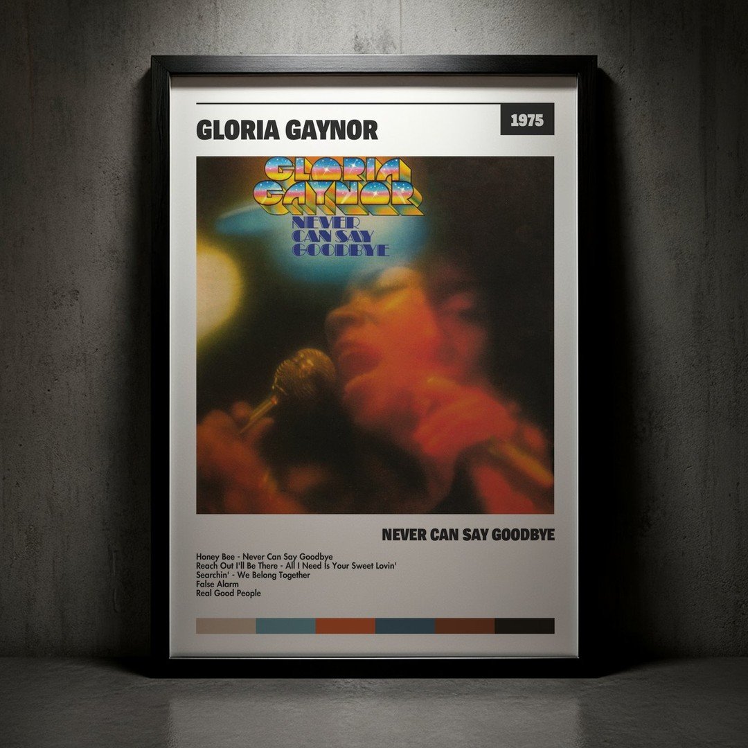 Nuestra colección de cuadros de Gloria Gaynor captura la esencia de sus álbumes más icónicos, presentados en un elegante estilo, en este caso te presentamos el de su disco Never Can Say Goodbye.