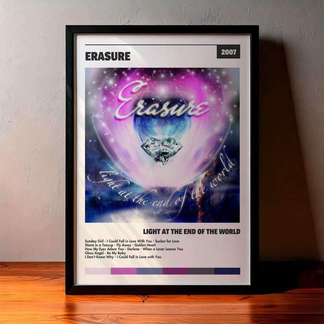 Nuestra colección de cuadros de Erasure captura la esencia de sus álbumes más icónicos, presentados en un elegante estilo, en este caso te presentamos el de su disco Light at the End of the World.