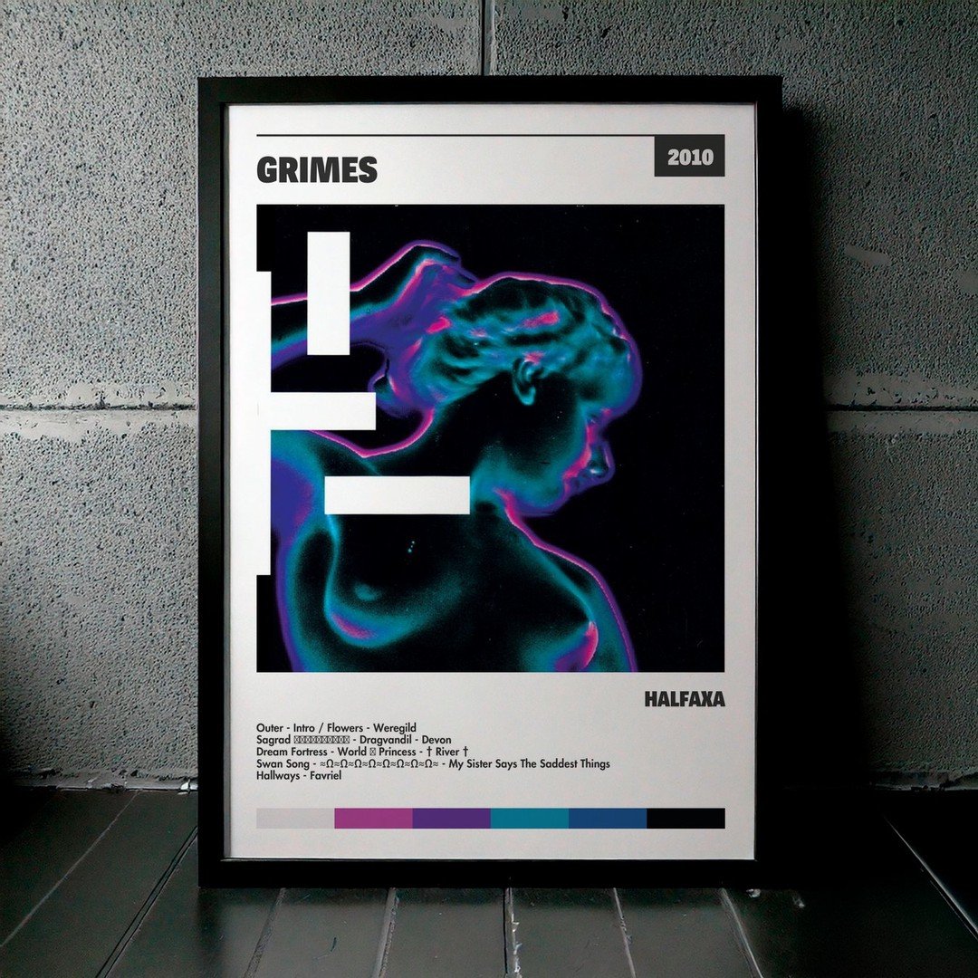 Nuestra colección de cuadros de Grimes captura la esencia de sus álbumes más icónicos, presentados en un elegante estilo, en este caso te presentamos el de su disco Halfaxa.