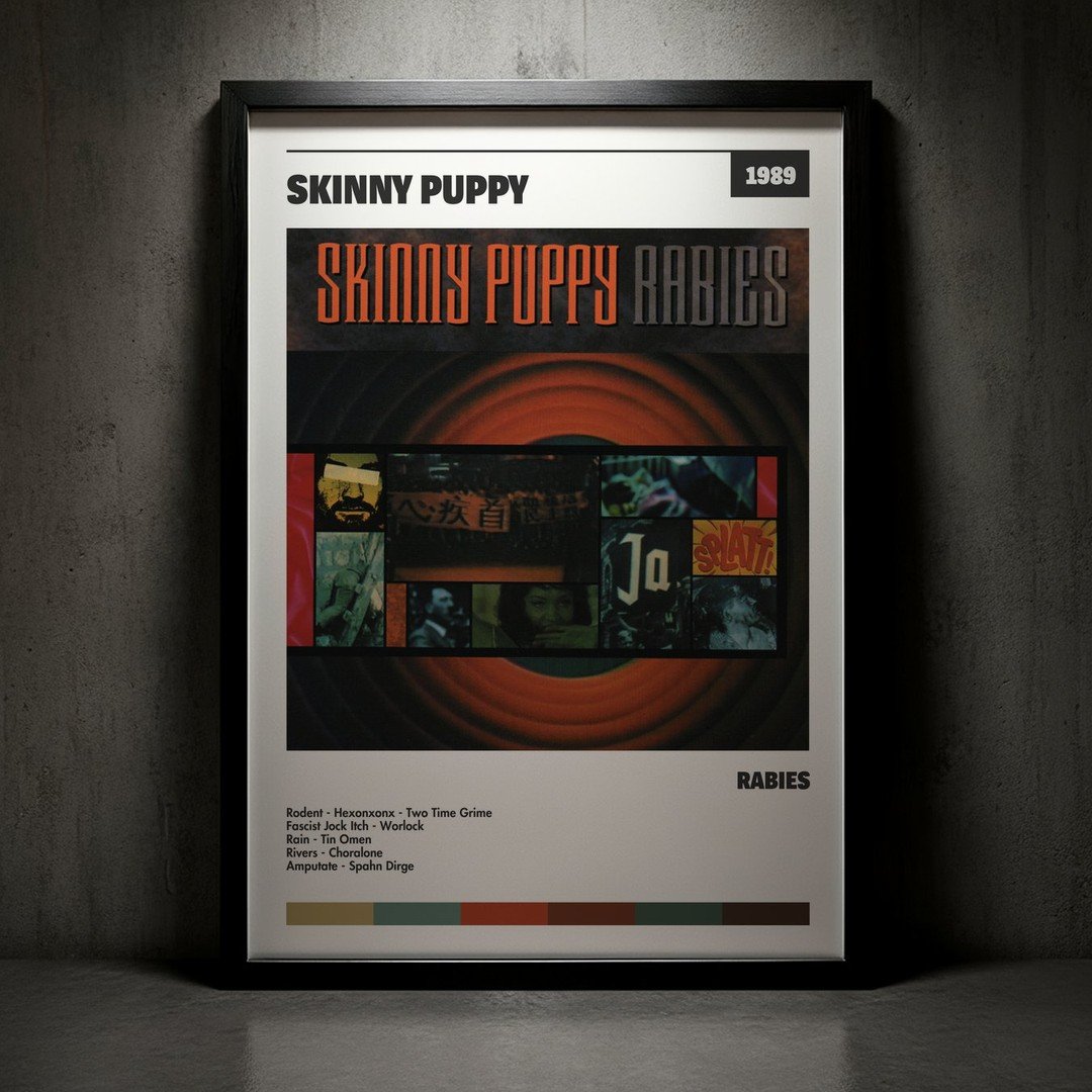 Nuestra colección de cuadros de Skinny Puppy captura la esencia de sus álbumes más icónicos, presentados en un elegante estilo, en este caso te presentamos el de su disco Rabies.