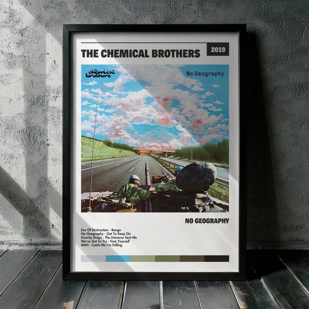 Nuestra colección de cuadros de The Chemical Brothers captura la esencia de sus álbumes más icónicos, presentados en un elegante estilo, en este caso te presentamos el de su disco No Geography.