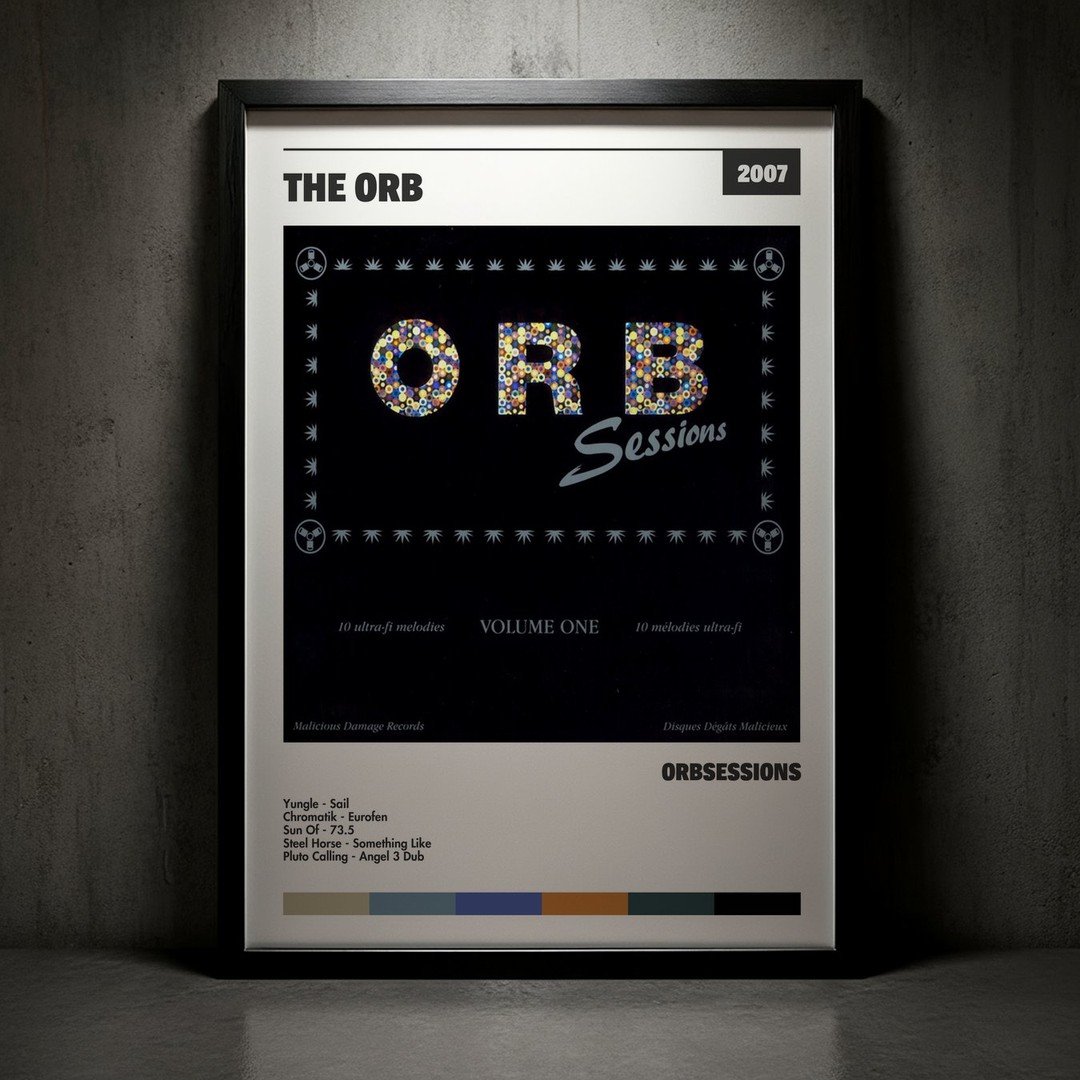 Nuestra colección de cuadros de The Orb captura la esencia de sus álbumes más icónicos, presentados en un elegante estilo, en este caso te presentamos el de su disco Orbsessions.