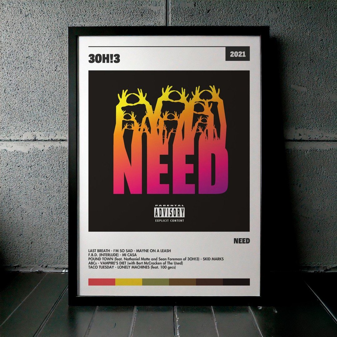 Nuestra colección de cuadros de 3OH!3 captura la esencia de sus álbumes más icónicos, presentados en un elegante estilo, en este caso te presentamos el de su disco NEED.