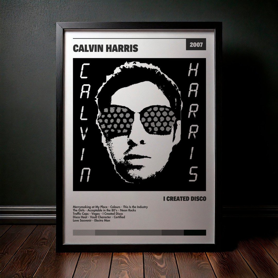 Nuestra colección de cuadros de Calvin Harris captura la esencia de sus álbumes más icónicos, presentados en un elegante estilo, en este caso te presentamos el de su disco I Created Disco.