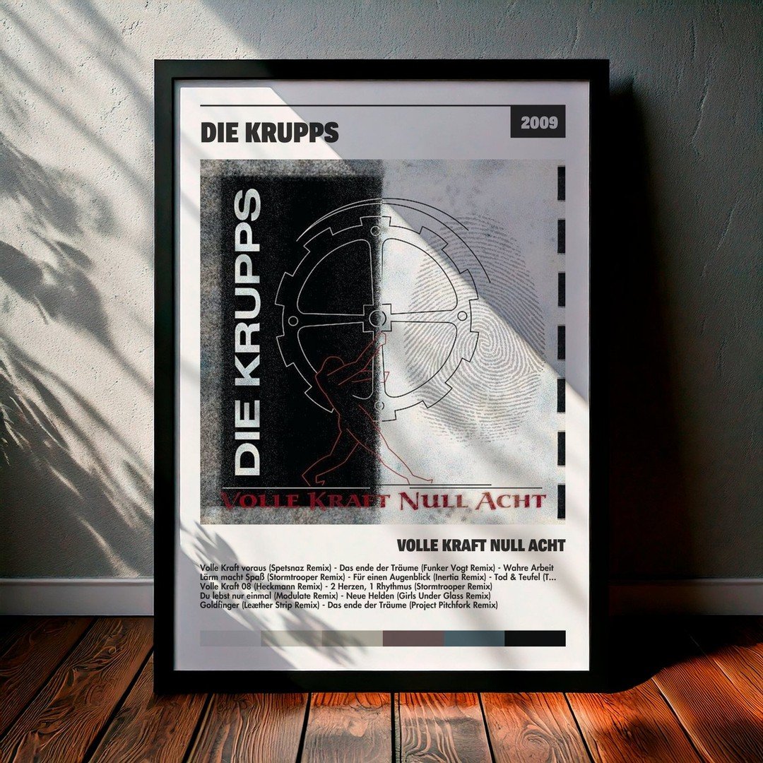 Nuestra colección de cuadros de Die Krupps captura la esencia de sus álbumes más icónicos, presentados en un elegante estilo, en este caso te presentamos el de su disco Volle Kraft null acht.