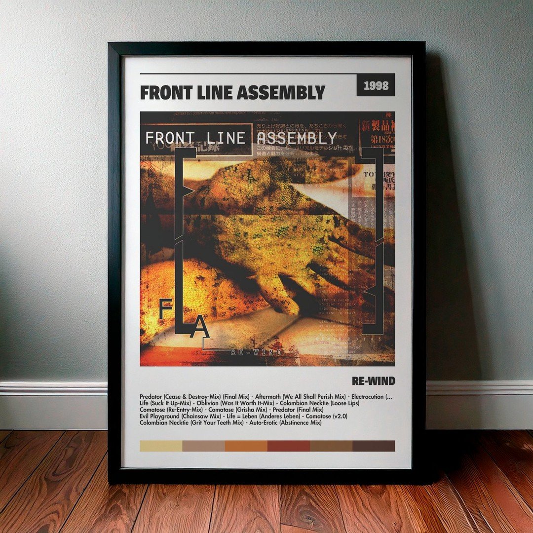 Nuestra colección de cuadros de Front Line Assembly captura la esencia de sus álbumes más icónicos, presentados en un elegante estilo, en este caso te presentamos el de su disco Re-Wind.