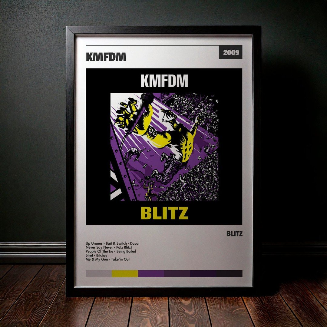Nuestra colección de cuadros de KMFDM captura la esencia de sus álbumes más icónicos, presentados en un elegante estilo, en este caso te presentamos el de su disco Blitz.