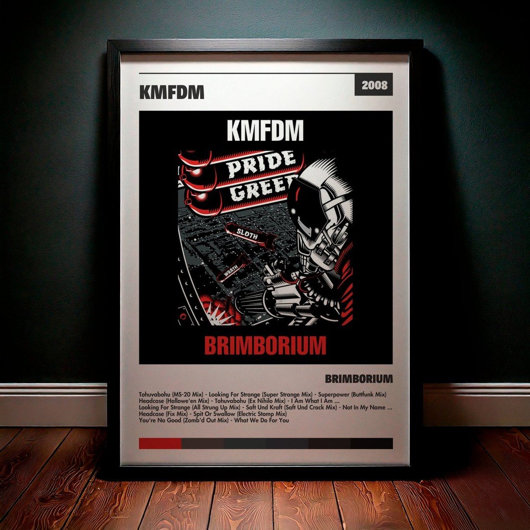 Nuestra colección de cuadros de KMFDM captura la esencia de sus álbumes más icónicos, presentados en un elegante estilo, en este caso te presentamos el de su disco Brimborium.