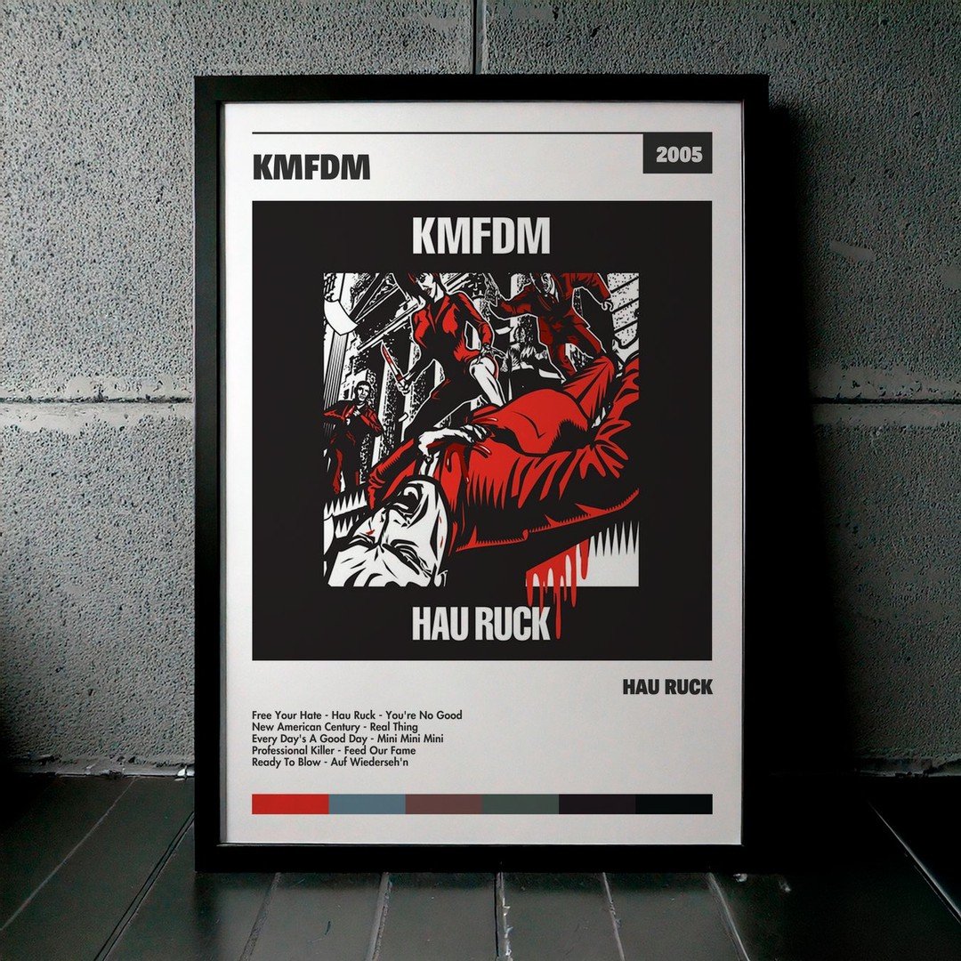 Nuestra colección de cuadros de KMFDM captura la esencia de sus álbumes más icónicos, presentados en un elegante estilo, en este caso te presentamos el de su disco Hau Ruck.