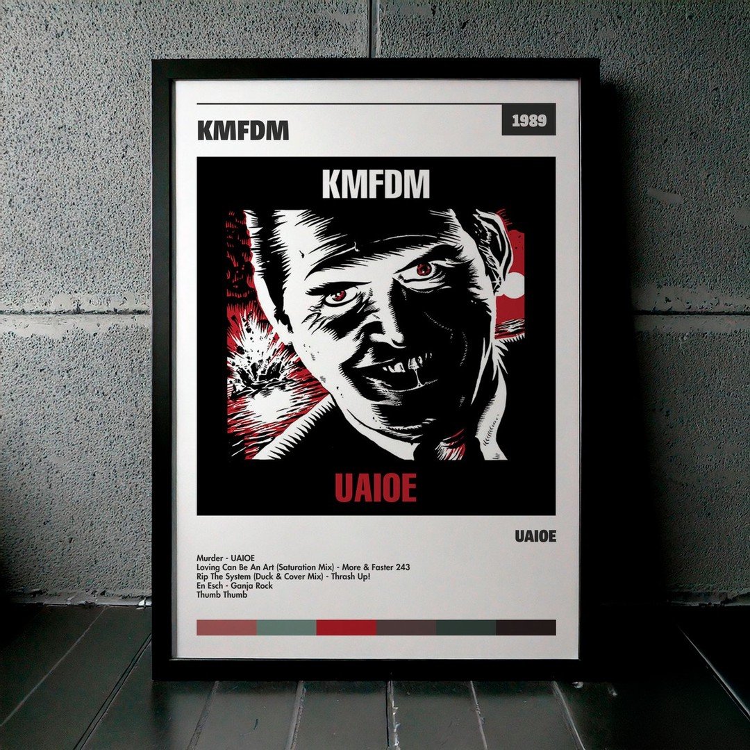 Nuestra colección de cuadros de KMFDM captura la esencia de sus álbumes más icónicos, presentados en un elegante estilo, en este caso te presentamos el de su disco UAIOE.