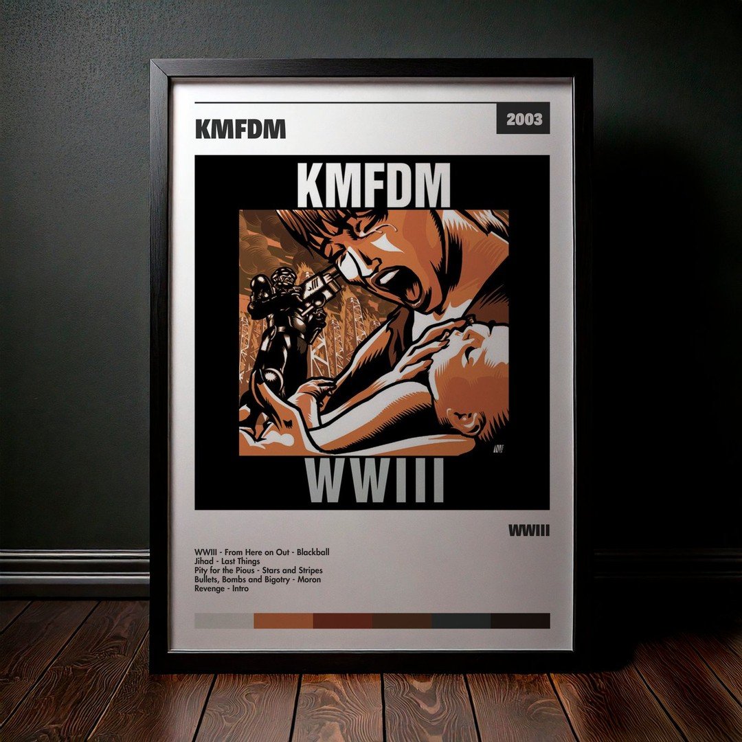Nuestra colección de cuadros de KMFDM captura la esencia de sus álbumes más icónicos, presentados en un elegante estilo, en este caso te presentamos el de su disco WWIII.