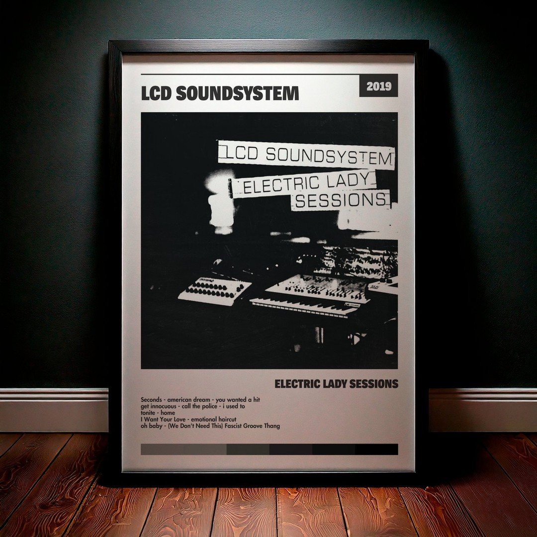 Nuestra colección de cuadros de LCD Soundsystem captura la esencia de sus álbumes más icónicos, presentados en un elegante estilo, en este caso te presentamos el de su disco Electric Lady Sessions.