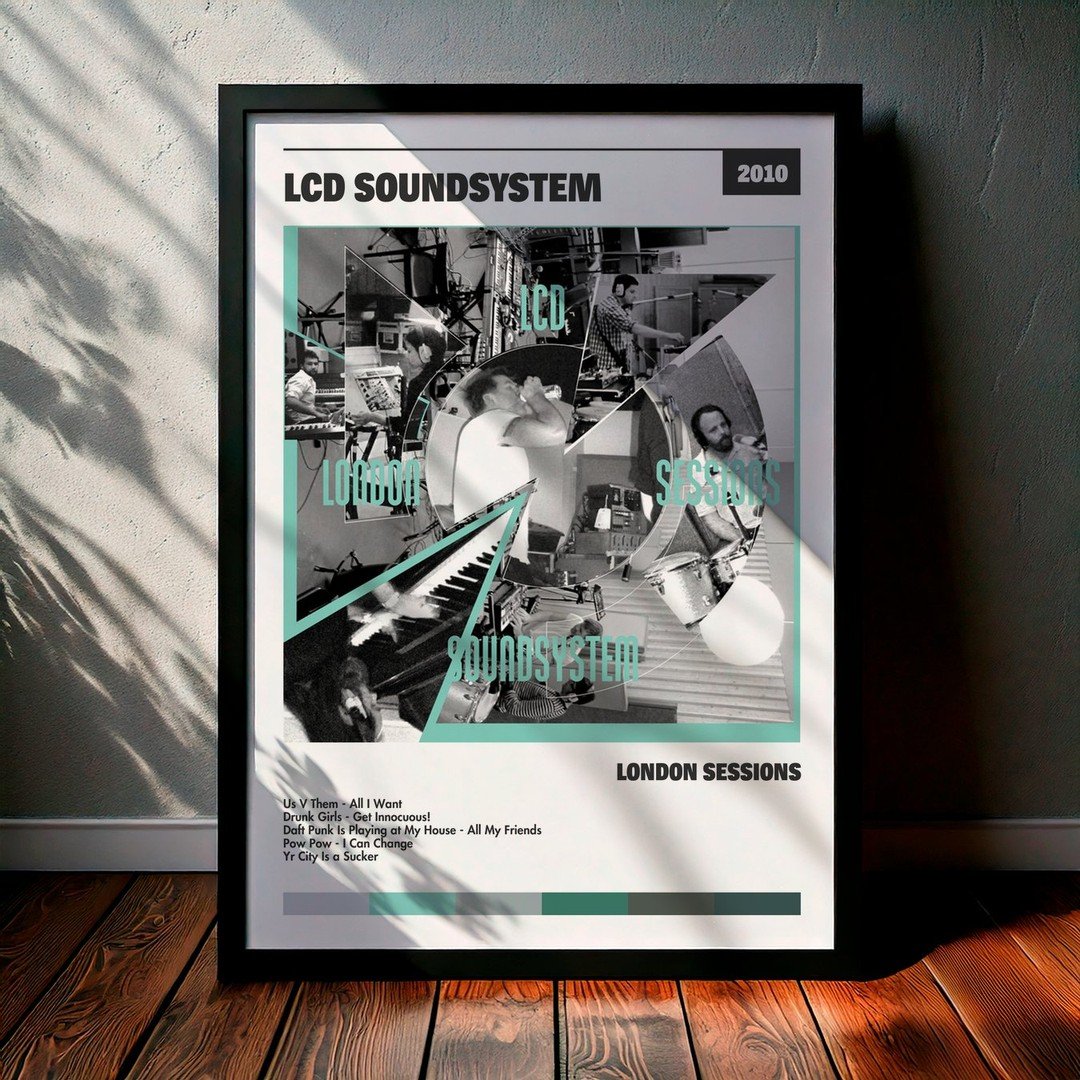 Nuestra colección de cuadros de LCD Soundsystem captura la esencia de sus álbumes más icónicos, presentados en un elegante estilo, en este caso te presentamos el de su disco London Sessions.