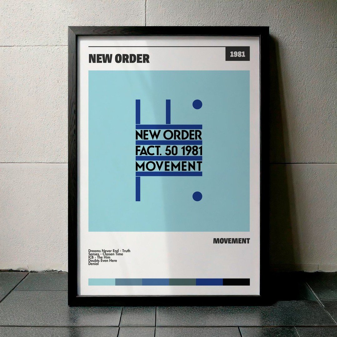 Nuestra colección de cuadros de New Order captura la esencia de sus álbumes más icónicos, presentados en un elegante estilo, en este caso te presentamos el de su disco Movement.