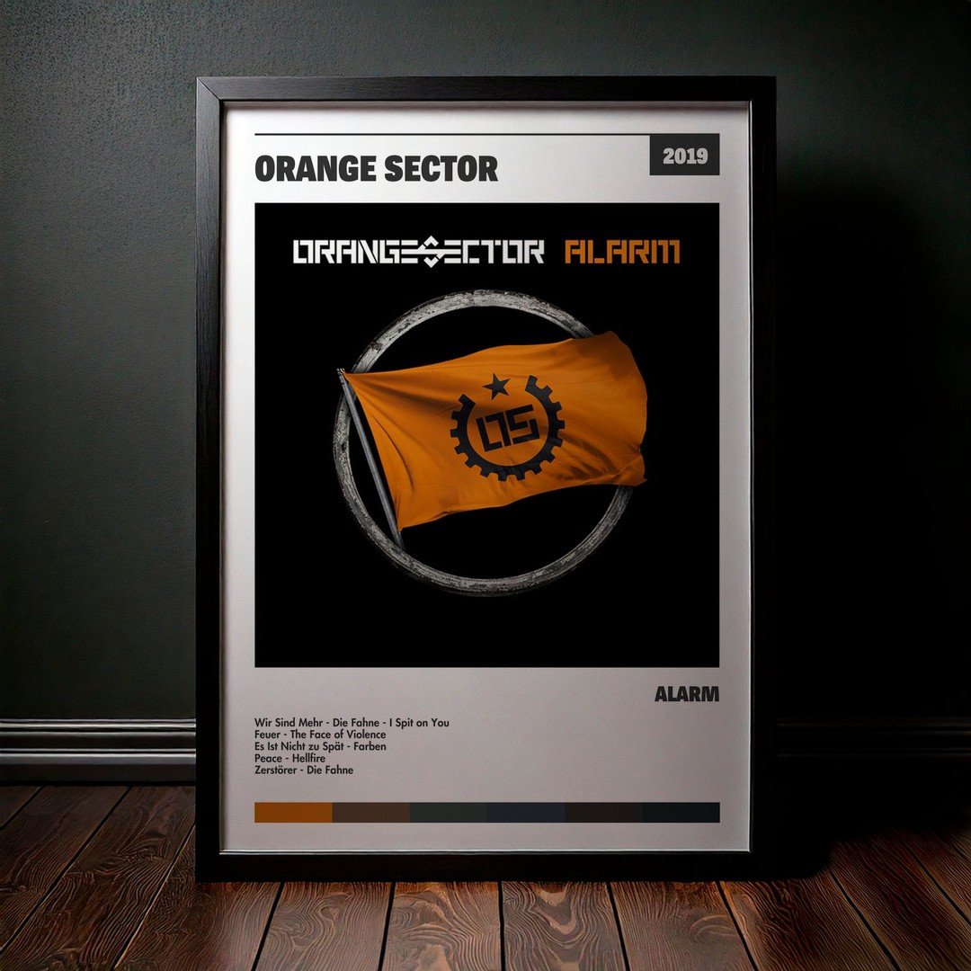 Nuestra colección de cuadros de Orange Sector captura la esencia de sus álbumes más icónicos, presentados en un elegante estilo, en este caso te presentamos el de su disco Alarm.
