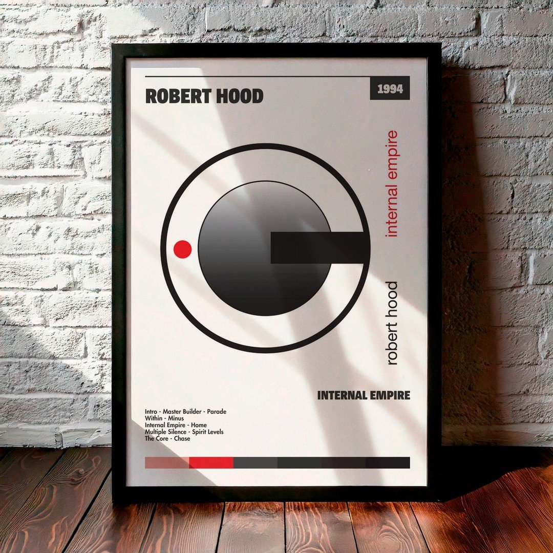 Nuestra colección de cuadros de Robert Hood captura la esencia de sus álbumes más icónicos, presentados en un elegante estilo, en este caso te presentamos el de su disco Internal Empire.