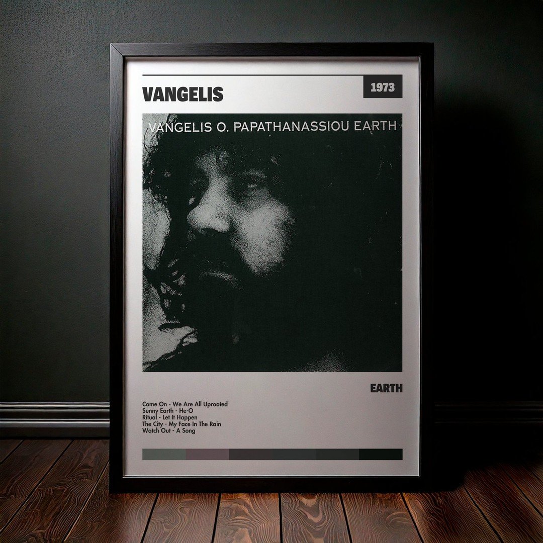 Nuestra colección de cuadros de Vangelis captura la esencia de sus álbumes más icónicos, presentados en un elegante estilo, en este caso te presentamos el de su disco Earth.