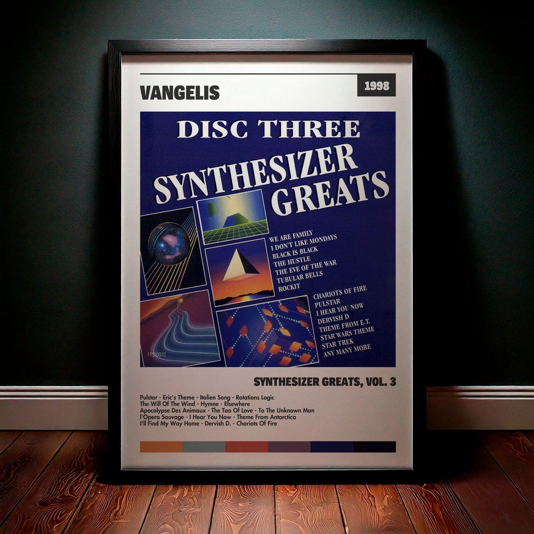 Nuestra colección de cuadros de Vangelis captura la esencia de sus álbumes más icónicos, presentados en un elegante estilo, en este caso te presentamos el de su disco Synthesizer Greats, Vol. 3.