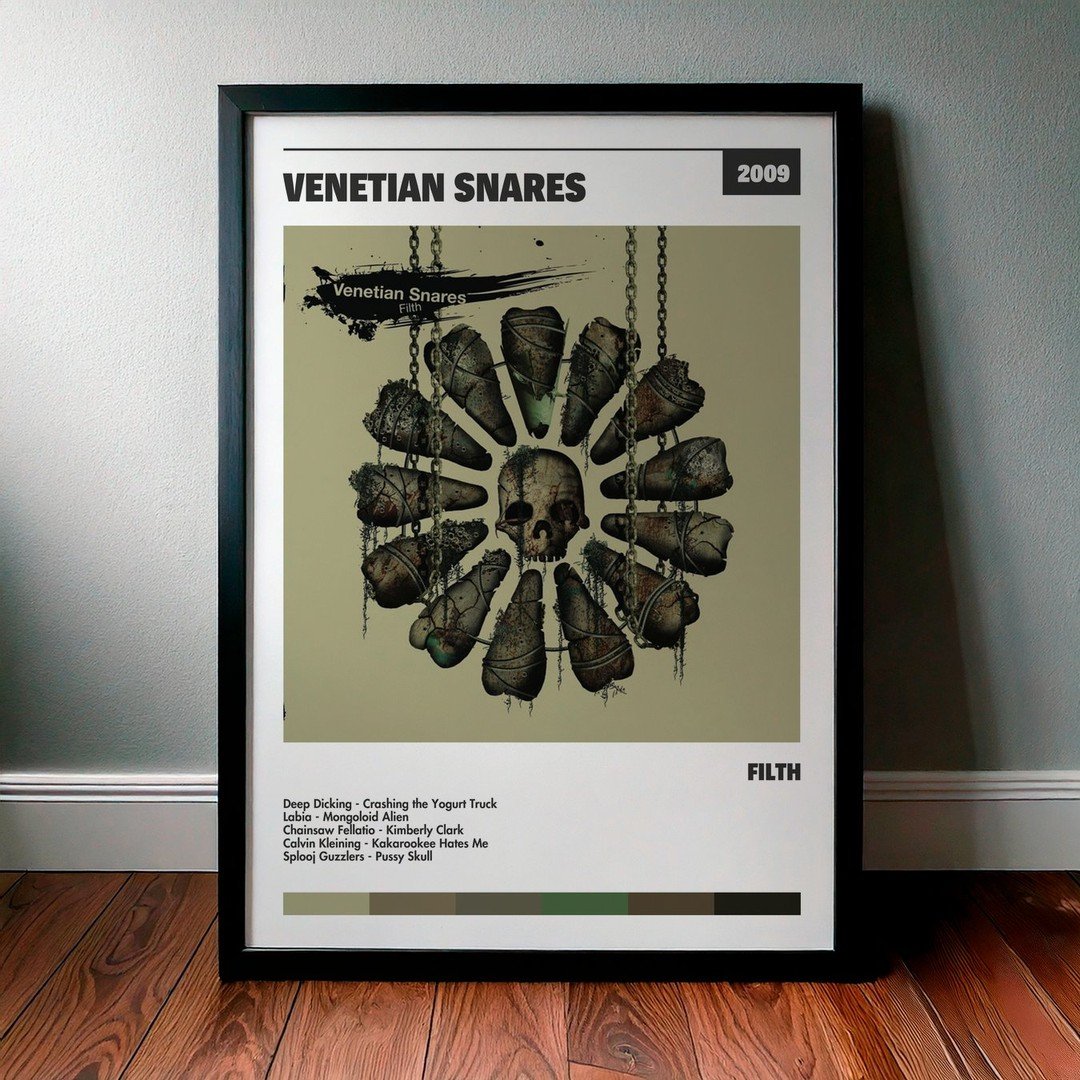 Nuestra colección de cuadros de Venetian Snares captura la esencia de sus álbumes más icónicos, presentados en un elegante estilo, en este caso te presentamos el de su disco Filth.