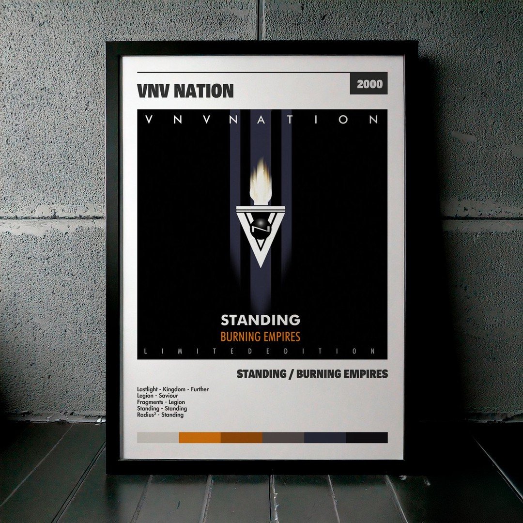 Nuestra colección de cuadros de VNV Nation captura la esencia de sus álbumes más icónicos, presentados en un elegante estilo, en este caso te presentamos el de su disco Standing / Burning Empires.