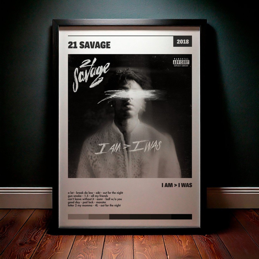 Nuestra colección de cuadros de 21 Savage captura la esencia de sus álbumes más icónicos, presentados en un elegante estilo, en este caso te presentamos el de su disco i am > i was.