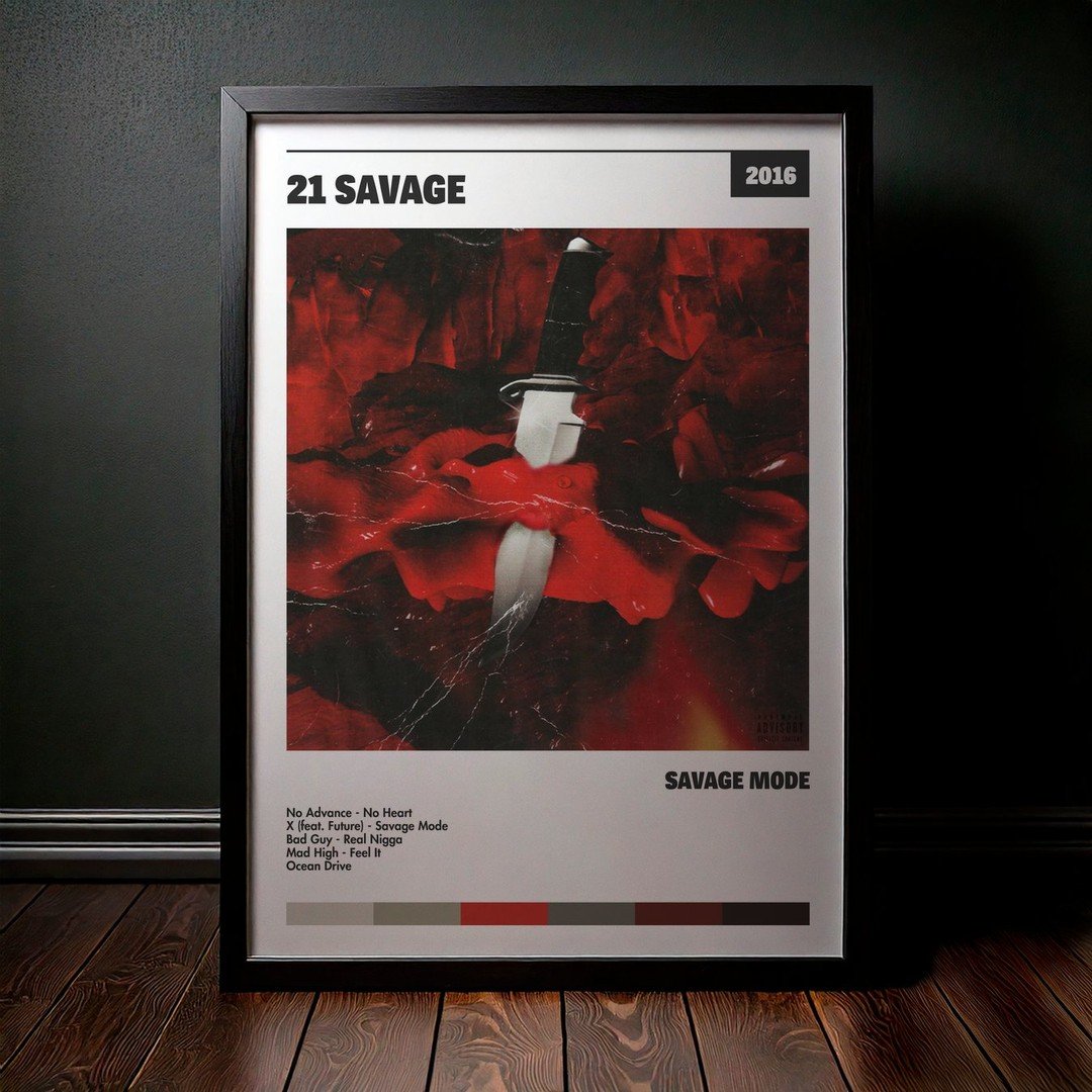 Nuestra colección de cuadros de 21 Savage captura la esencia de sus álbumes más icónicos, presentados en un elegante estilo, en este caso te presentamos el de su disco Savage Mode.