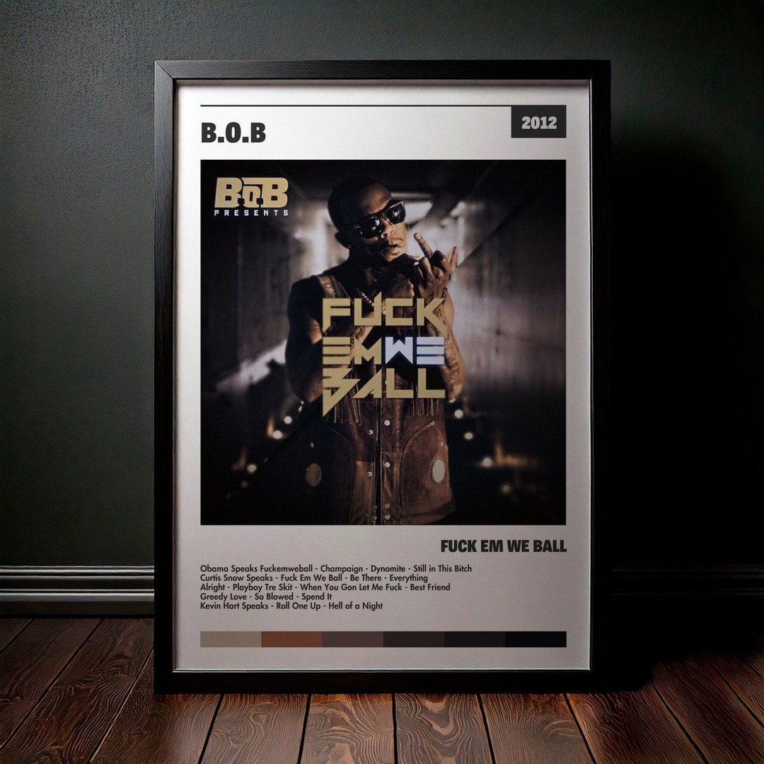 Nuestra colección de cuadros de B.o.B captura la esencia de sus álbumes más icónicos, presentados en un elegante estilo, en este caso te presentamos el de su disco Fuck Em We Ball.