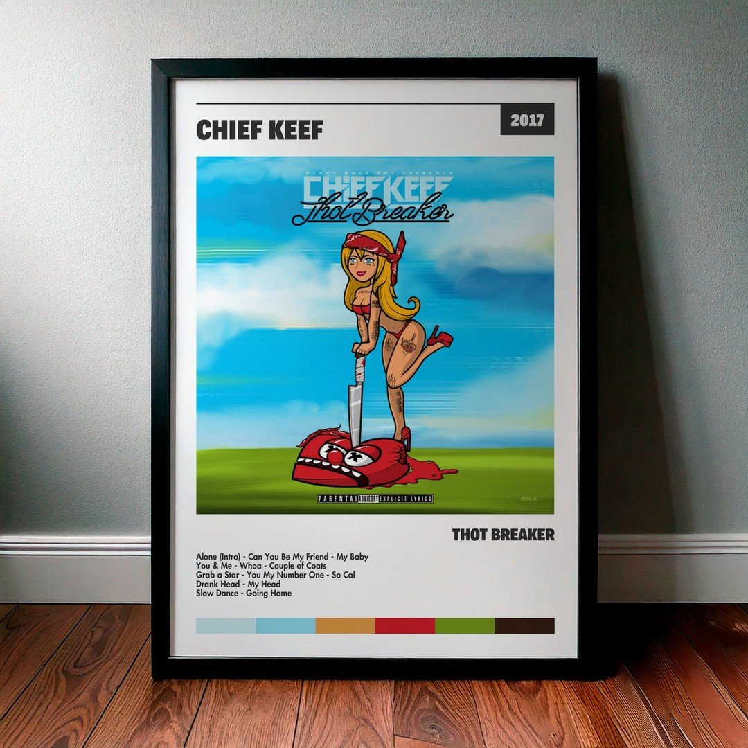 Nuestra colección de cuadros de Chief Keef captura la esencia de sus álbumes más icónicos, presentados en un elegante estilo, en este caso te presentamos el de su disco Thot Breaker.