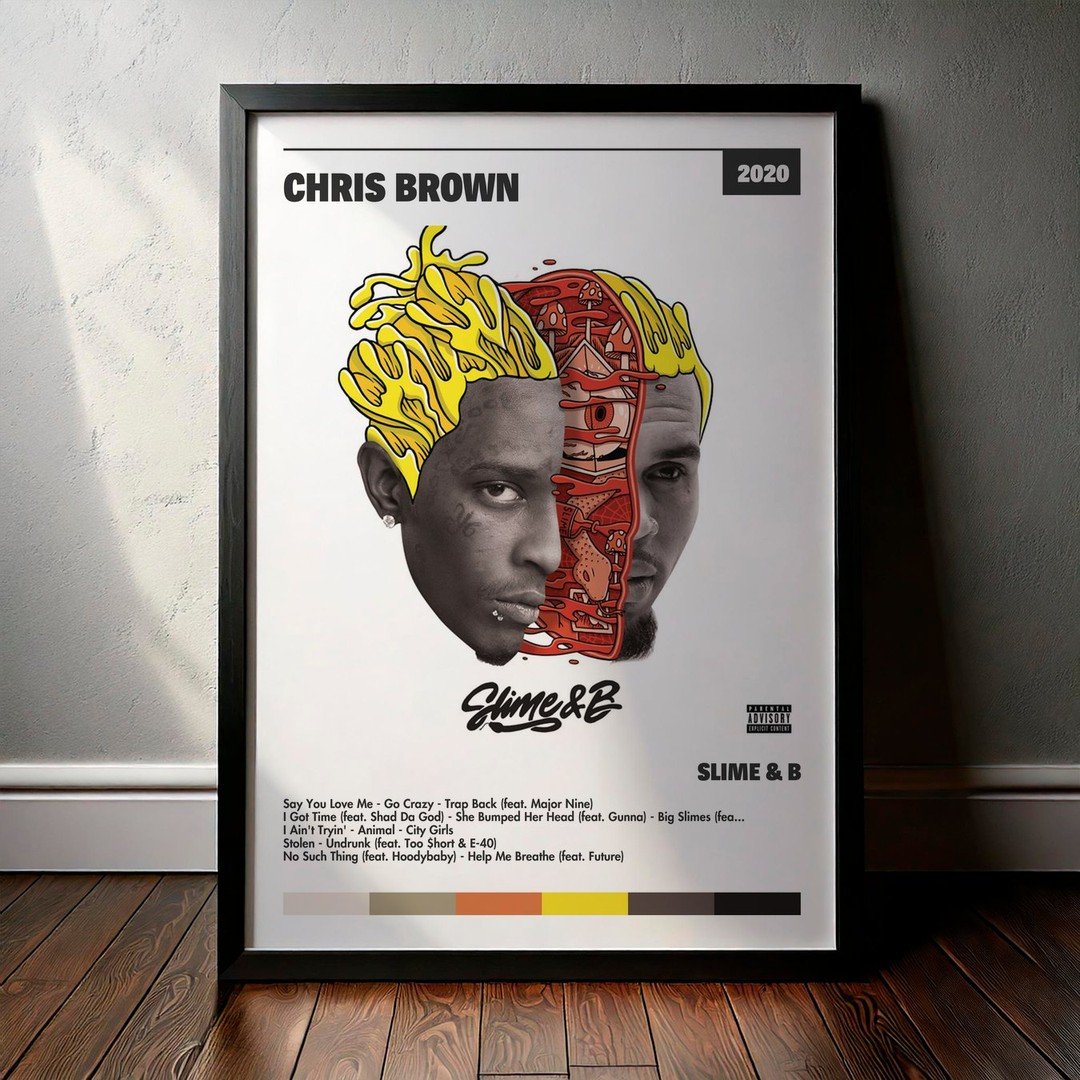 Nuestra colección de cuadros de Chris Brown captura la esencia de sus álbumes más icónicos, presentados en un elegante estilo, en este caso te presentamos el de su disco Slime & B.