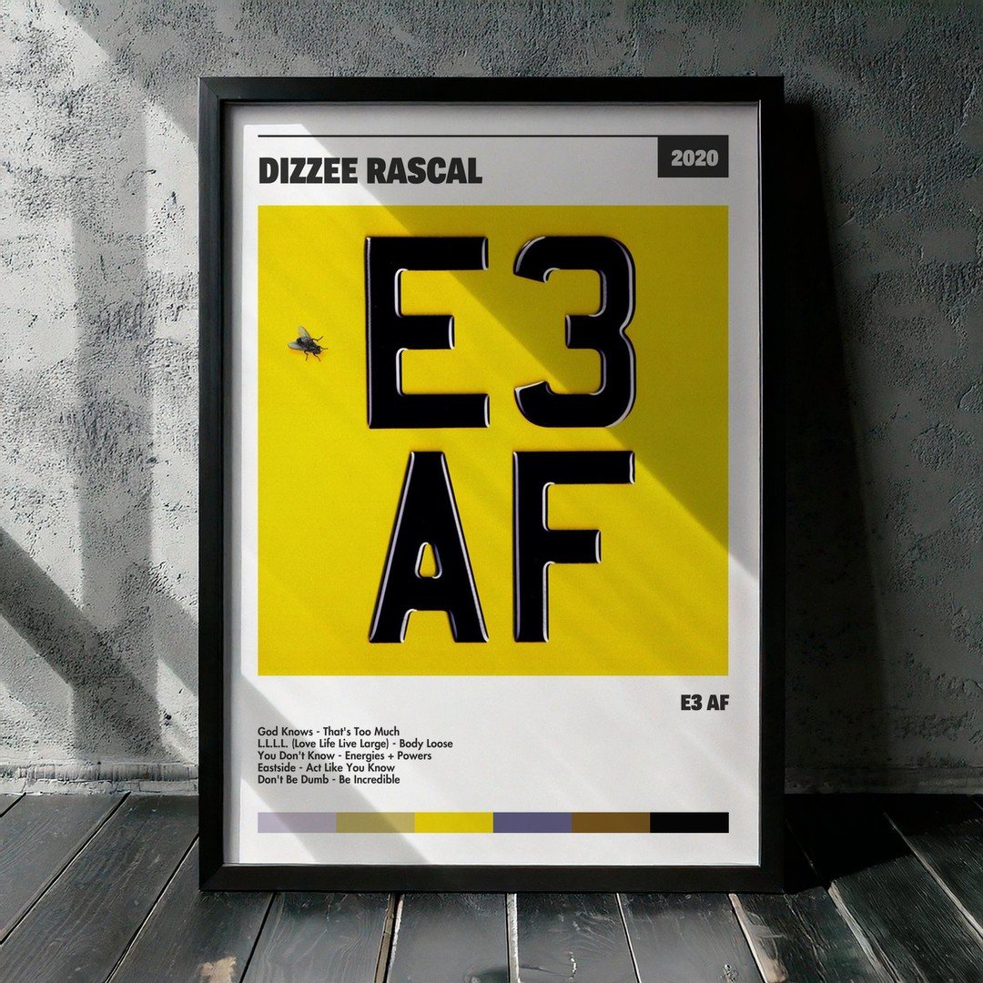 Nuestra colección de cuadros de Dizzee Rascal captura la esencia de sus álbumes más icónicos, presentados en un elegante estilo, en este caso te presentamos el de su disco E3 AF.