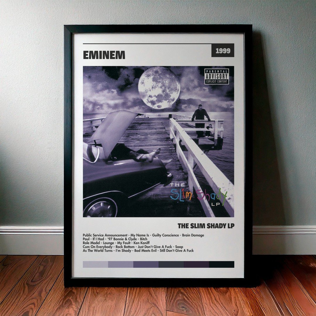 Nuestra colección de cuadros de Eminem captura la esencia de sus álbumes más icónicos, presentados en un elegante estilo, en este caso te presentamos el de su disco The Slim Shady LP.