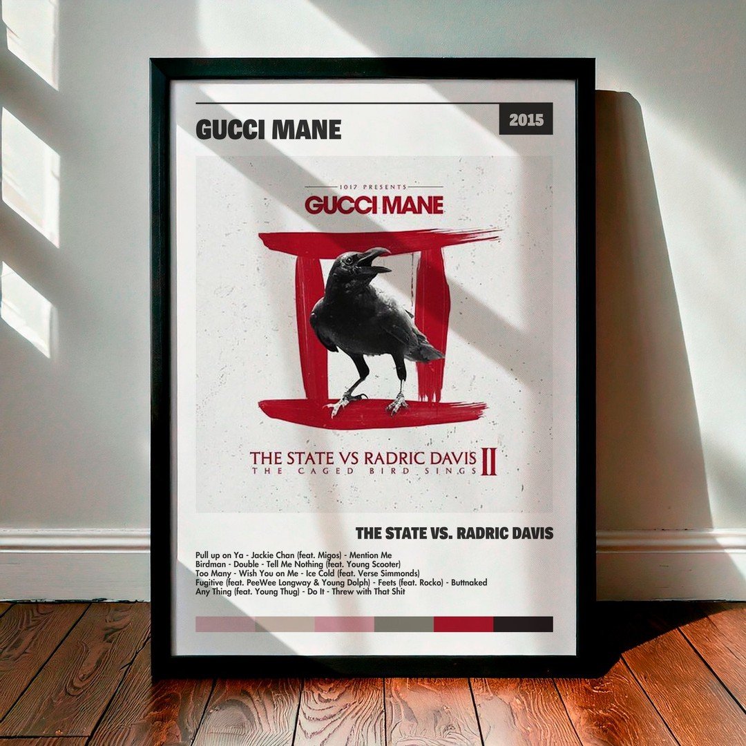 Nuestra colección de cuadros de Gucci Mane captura la esencia de sus álbumes más icónicos, presentados en un elegante estilo, en este caso te presentamos el de su disco The State vs. Radric Davis.