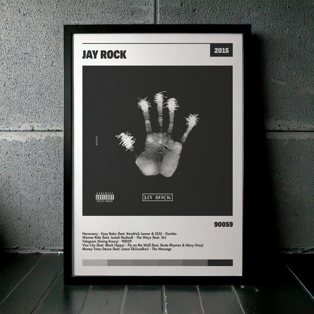 Nuestra colección de cuadros de Jay Rock captura la esencia de sus álbumes más icónicos, presentados en un elegante estilo, en este caso te presentamos el de su disco 90059.