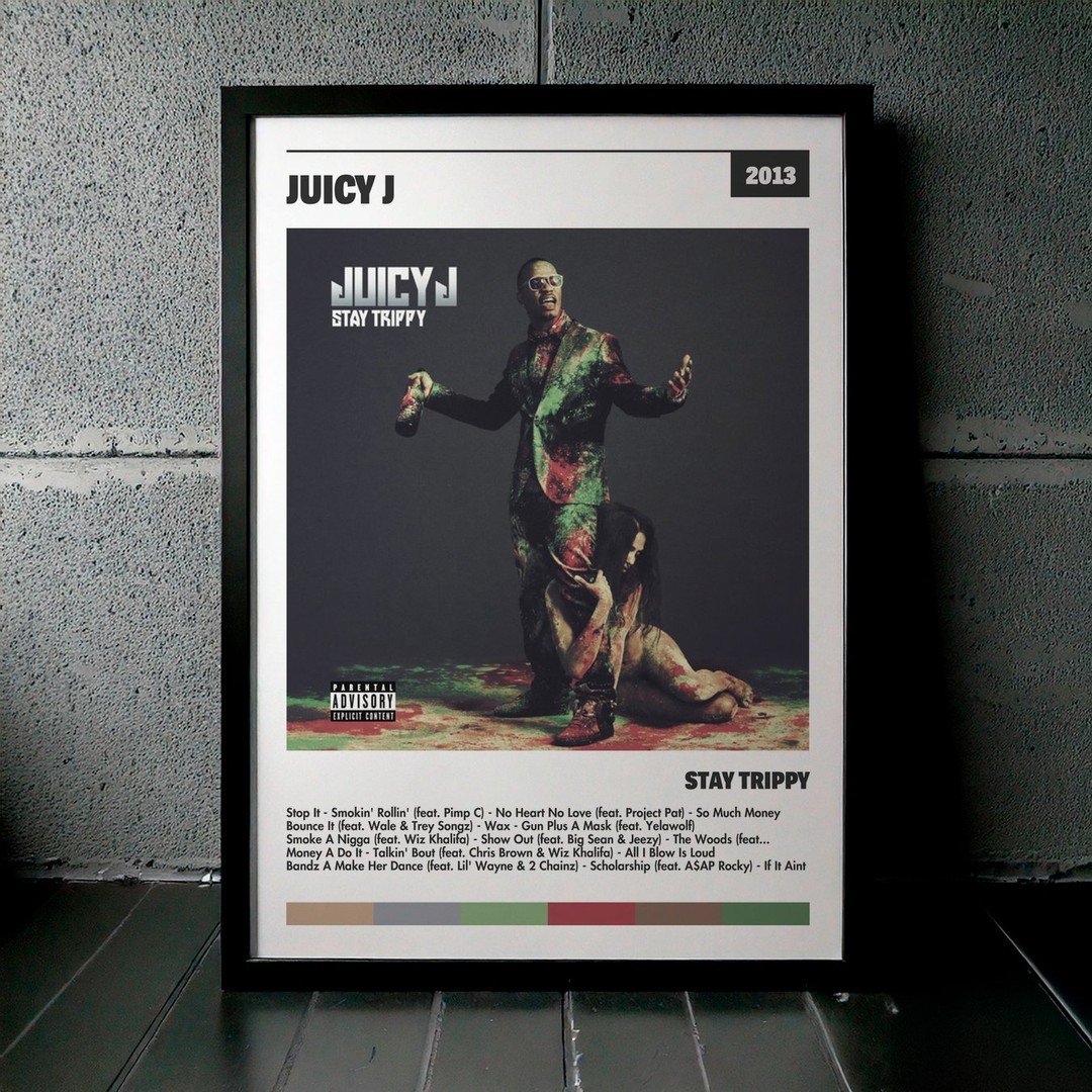 Nuestra colección de cuadros de Juicy J captura la esencia de sus álbumes más icónicos, presentados en un elegante estilo, en este caso te presentamos el de su disco Stay Trippy.