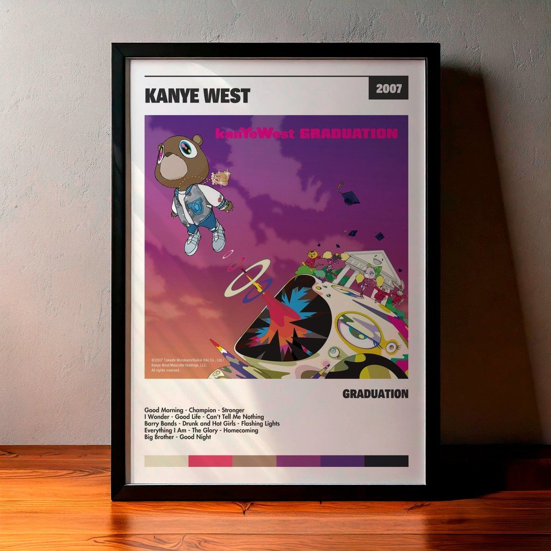 Nuestra colección de cuadros de Kanye West captura la esencia de sus álbumes más icónicos, presentados en un elegante estilo, en este caso te presentamos el de su disco Graduation.