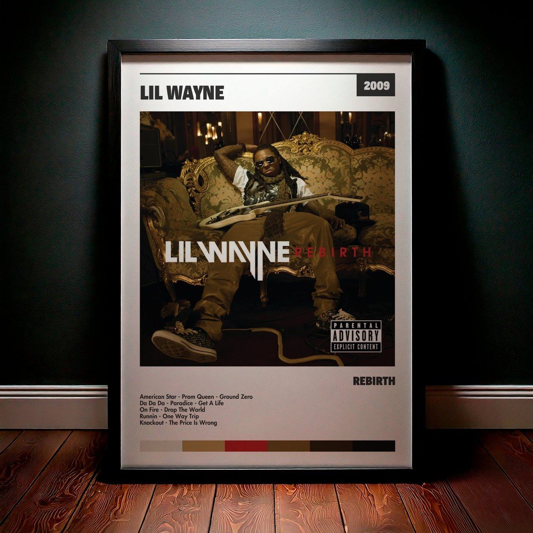 Nuestra colección de cuadros de Lil Wayne captura la esencia de sus álbumes más icónicos, presentados en un elegante estilo, en este caso te presentamos el de su disco Rebirth.