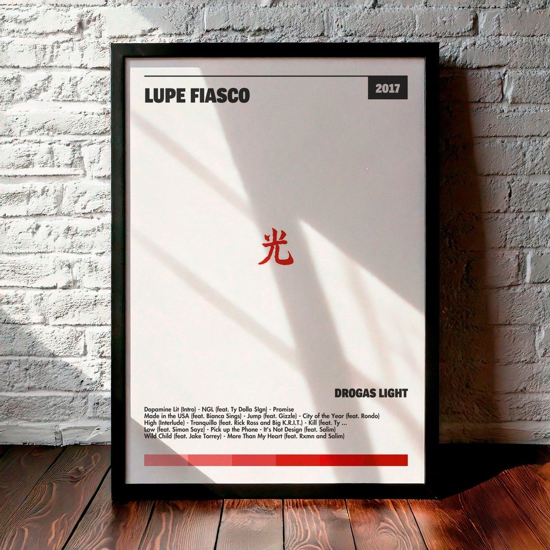 Nuestra colección de cuadros de Lupe Fiasco captura la esencia de sus álbumes más icónicos, presentados en un elegante estilo, en este caso te presentamos el de su disco DROGAS Light.