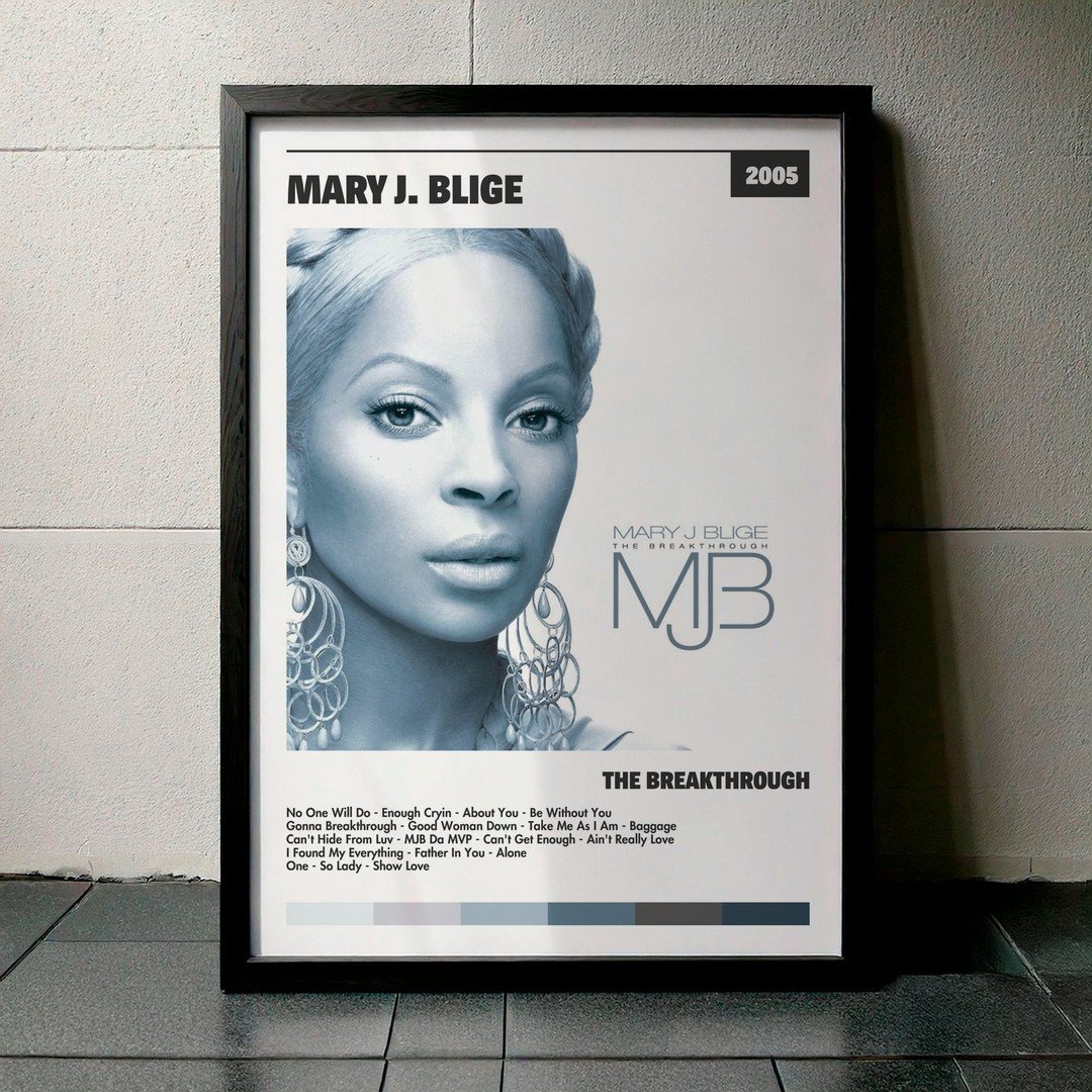 Nuestra colección de cuadros de Mary J. Blige captura la esencia de sus álbumes más icónicos, presentados en un elegante estilo, en este caso te presentamos el de su disco The Breakthrough.
