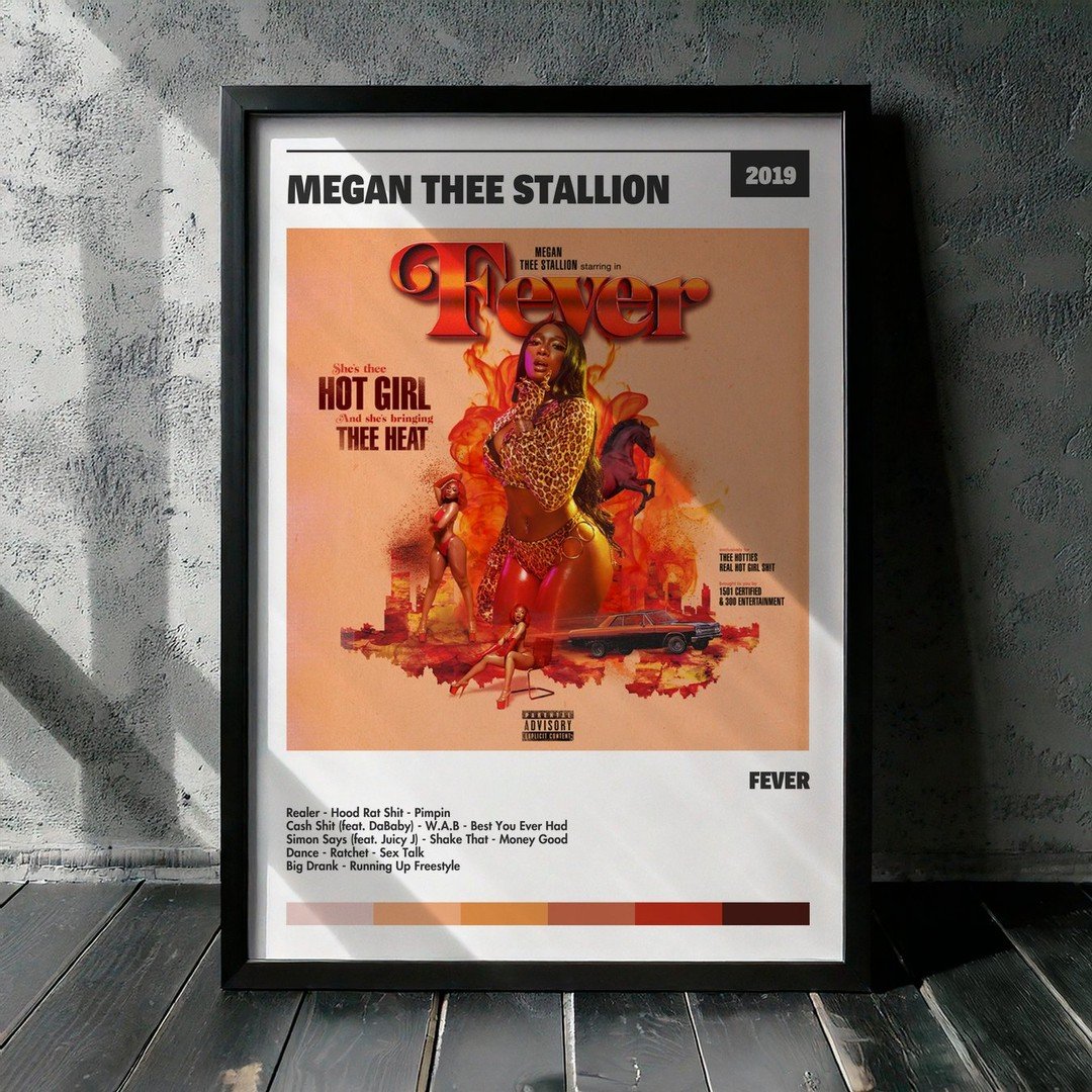 Nuestra colección de cuadros de Megan Thee Stallion captura la esencia de sus álbumes más icónicos, presentados en un elegante estilo, en este caso te presentamos el de su disco Fever.