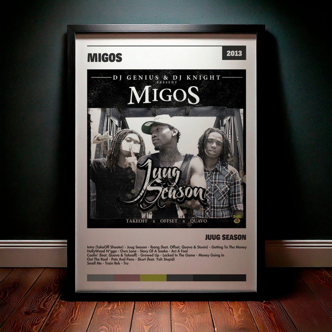 Nuestra colección de cuadros de Migos captura la esencia de sus álbumes más icónicos, presentados en un elegante estilo, en este caso te presentamos el de su disco Juug Season.