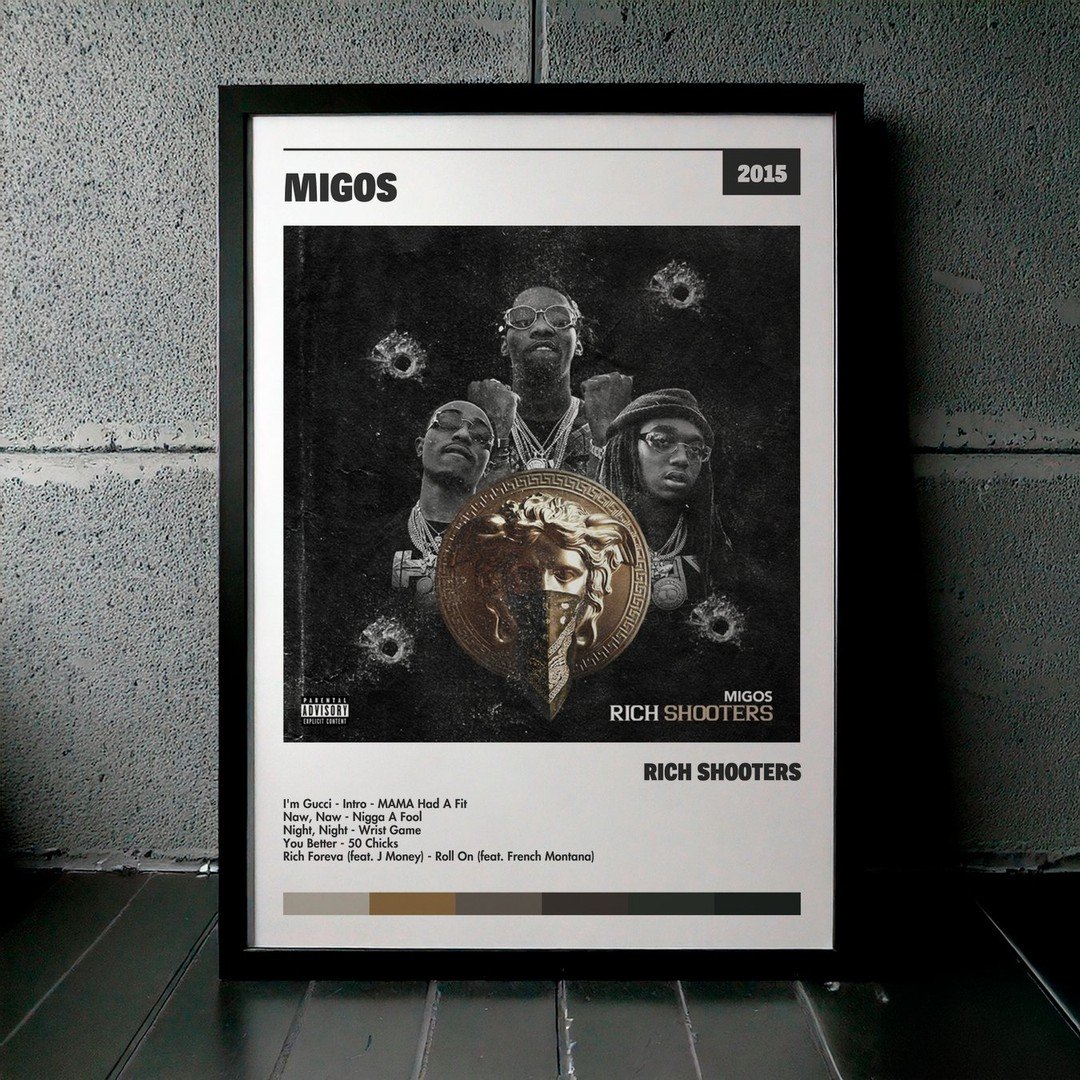 Nuestra colección de cuadros de Migos captura la esencia de sus álbumes más icónicos, presentados en un elegante estilo, en este caso te presentamos el de su disco Rich Shooters.