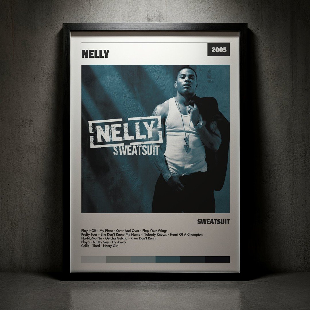 Nuestra colección de cuadros de Nelly captura la esencia de sus álbumes más icónicos, presentados en un elegante estilo, en este caso te presentamos el de su disco Sweatsuit.