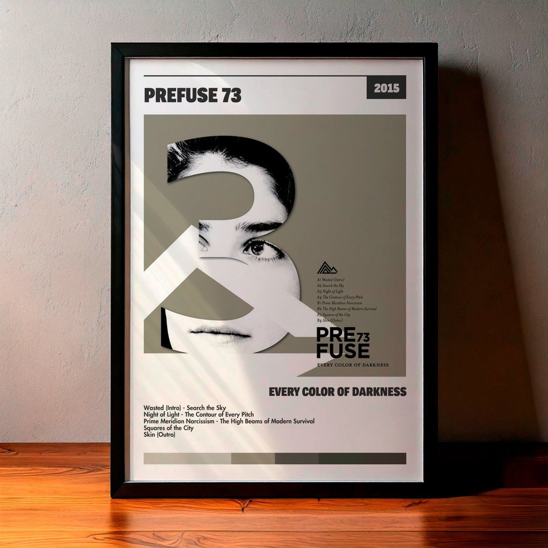 Nuestra colección de cuadros de Prefuse 73 captura la esencia de sus álbumes más icónicos, presentados en un elegante estilo, en este caso te presentamos el de su disco Every Color of Darkness.