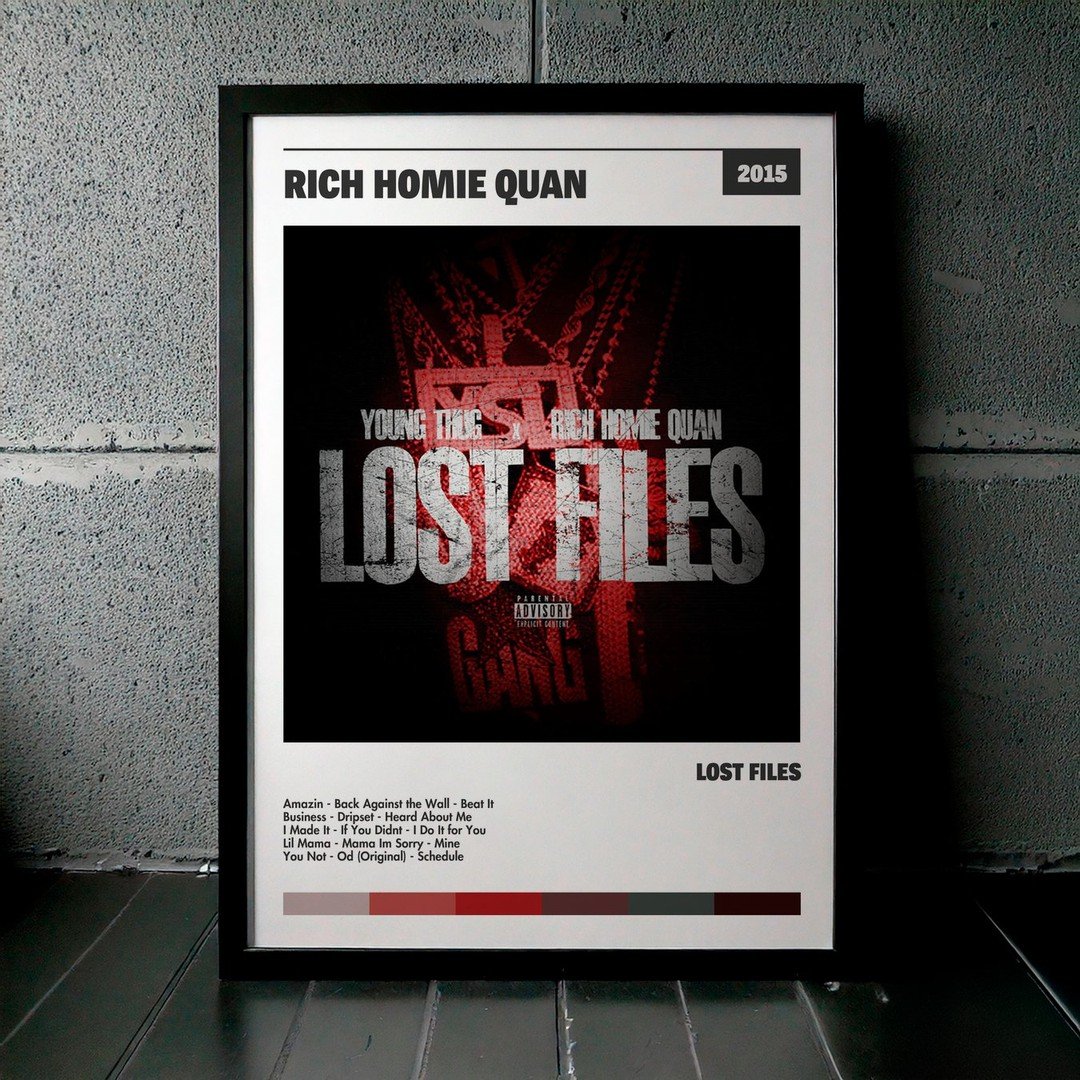Nuestra colección de cuadros de Rich Homie Quan captura la esencia de sus álbumes más icónicos, presentados en un elegante estilo, en este caso te presentamos el de su disco Lost Files.