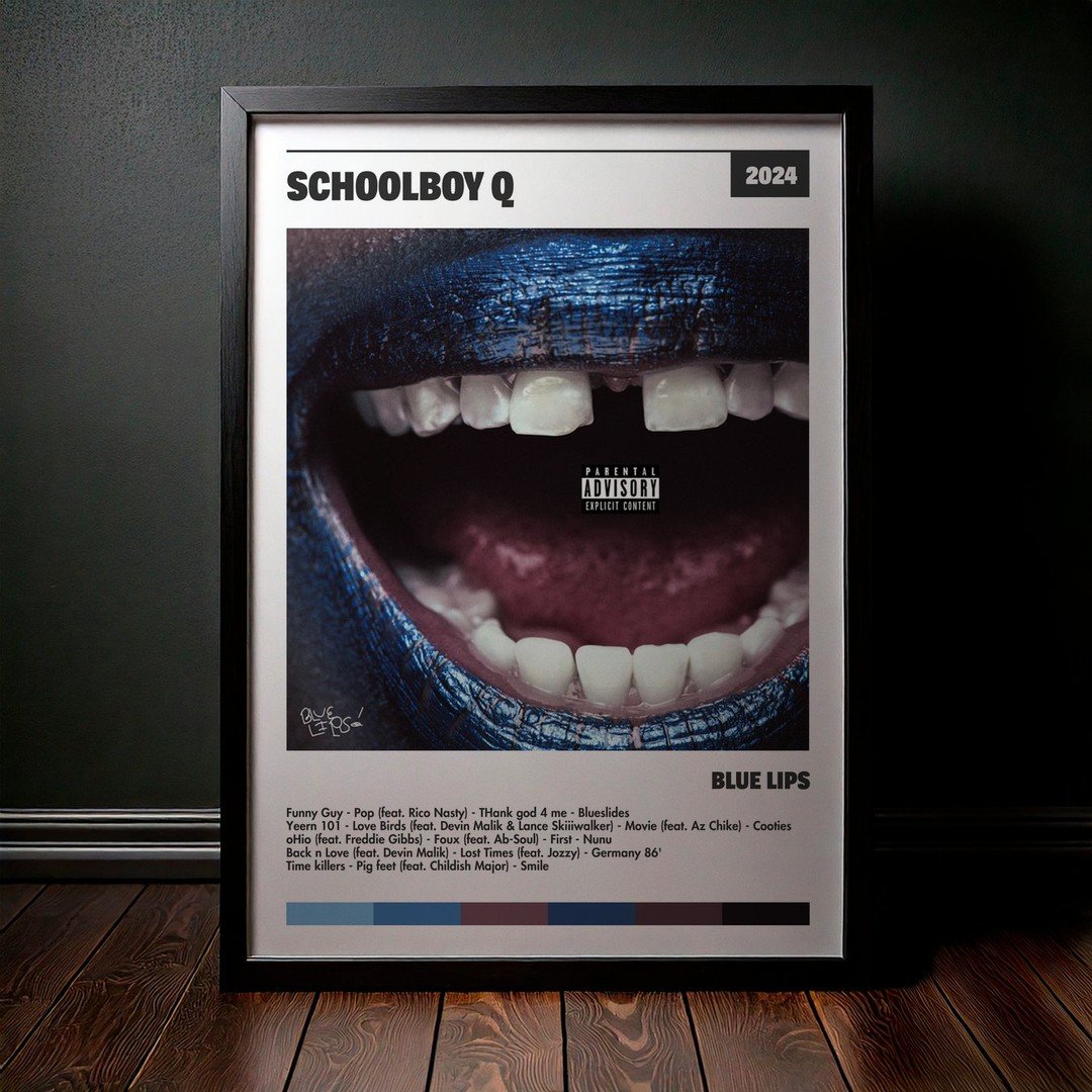 Nuestra colección de cuadros de ScHoolboy Q captura la esencia de sus álbumes más icónicos, presentados en un elegante estilo, en este caso te presentamos el de su disco BLUE LIPS.