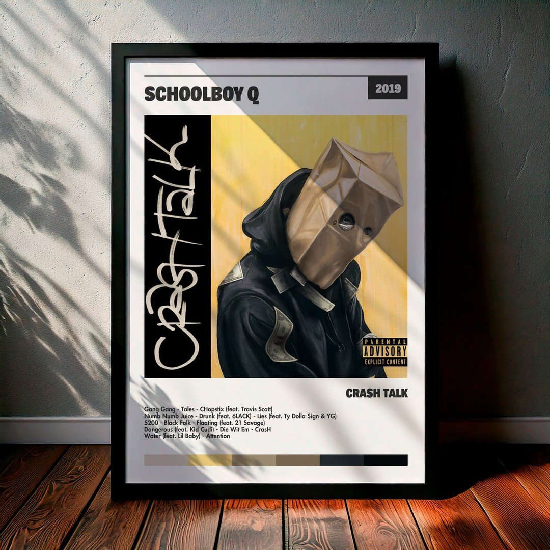 Nuestra colección de cuadros de ScHoolboy Q captura la esencia de sus álbumes más icónicos, presentados en un elegante estilo, en este caso te presentamos el de su disco CrasH Talk.