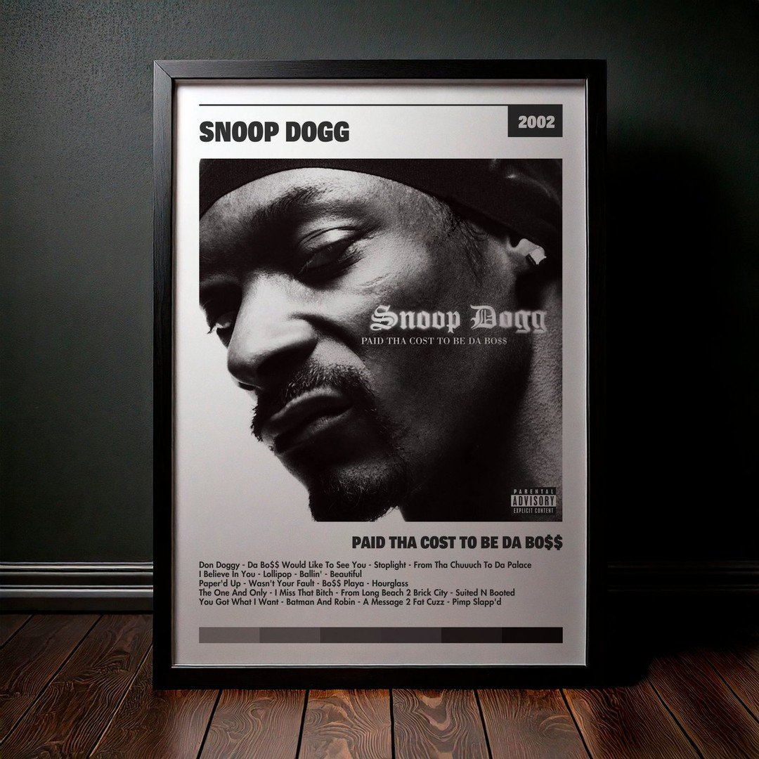 Nuestra colección de cuadros de Snoop Dogg captura la esencia de sus álbumes más icónicos, presentados en un elegante estilo, en este caso te presentamos el de su disco Paid Tha Cost To Be Da Bo$$.