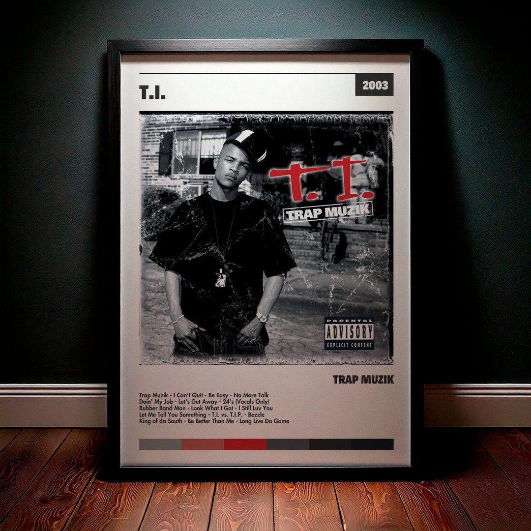 Nuestra colección de cuadros de T.I. captura la esencia de sus álbumes más icónicos, presentados en un elegante estilo, en este caso te presentamos el de su disco Trap Muzik.