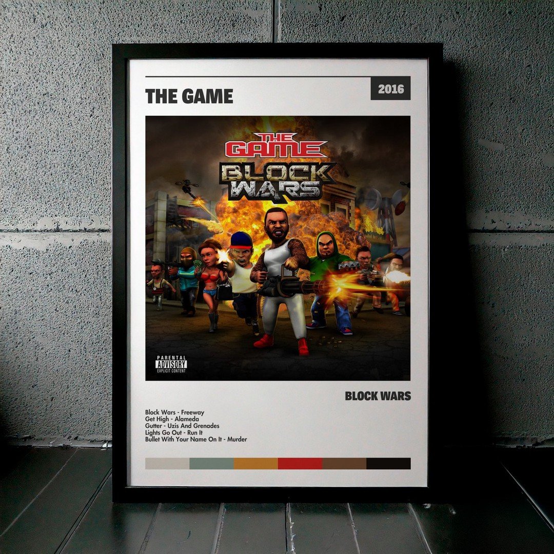 Nuestra colección de cuadros de The Game captura la esencia de sus álbumes más icónicos, presentados en un elegante estilo, en este caso te presentamos el de su disco Block Wars.